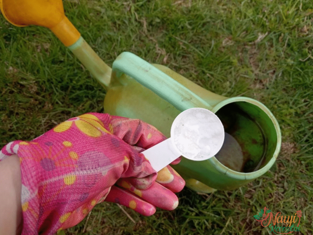 Devyniabriaunę spiralę paruošiu iš anksto. Tam 1 dalį devyniabriaunės spiralės užpilu 10 litrų vandens kibire su vandeniu ir palieku 7 dienoms. Periodiškai pamaišau. Po savaitės fermentacijos procesas baigtas ir trąšos paruoštos. Tačiau svarbu atsiminti, kad gautas tirpalas yra labai koncentruotas, todėl imu tik 500 ml devyniabriaunės spiralės tirpalo ir supilu į 10 litrų vandens, kuriame praskiedau kalio monofosfatą.