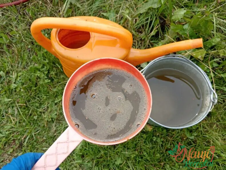 Dėl to gaunu maistinių medžiagų tirpalą, nes kibire yra azoto, fosforo ir kalio. Po krūmu užpilu 500 ml tirpalo. Po tokio tręšimo cukinijos greitai pradės augti, o vaisiai nesupūs.