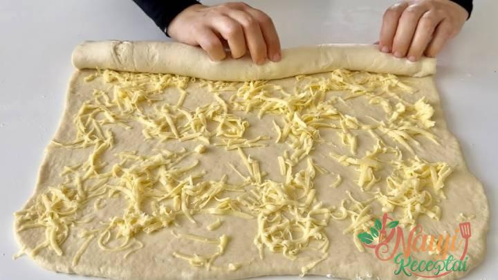Ant kiekvieno uždėkite po gabalėlį sūrio. Padalinkite į 8 dalis ir susukite.