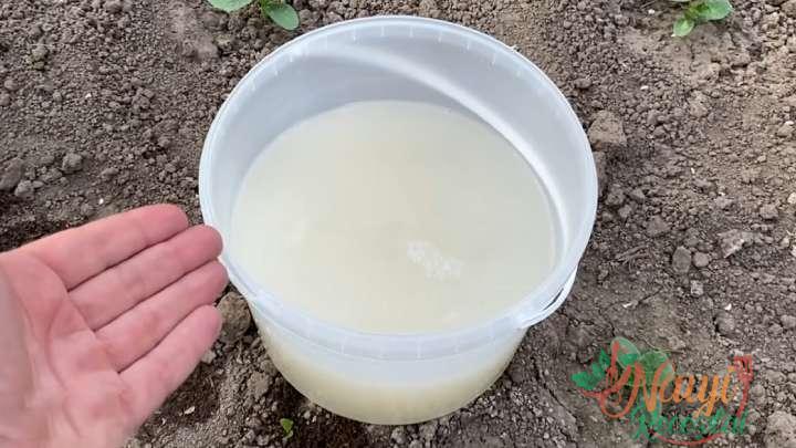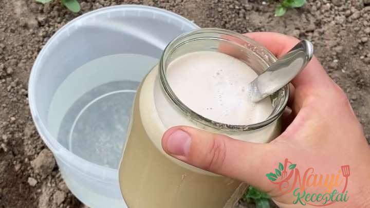 Pirmiausia palaistykite visus agurkus paprastu vandeniu. Tada, norėdami paruošti trąšas, į 10 litrų vandens įpilkite 1 litrą koncentrato.