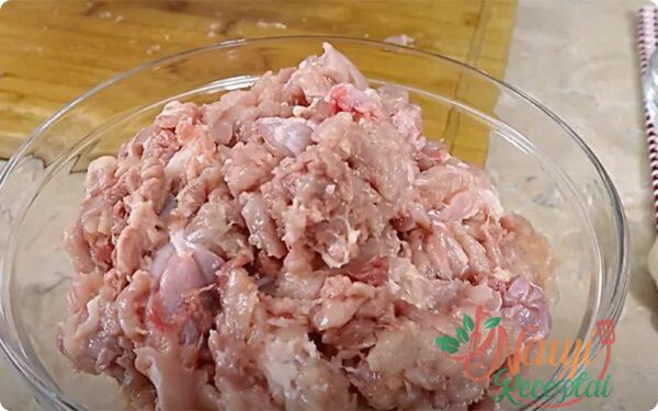 Iš vištienos blauzdelių išpjaukite kaulus ir užvirinkite juos nedideliame puode. Maždaug pusę litro vandens arba šiek tiek daugiau.