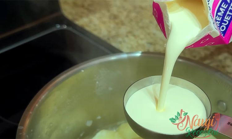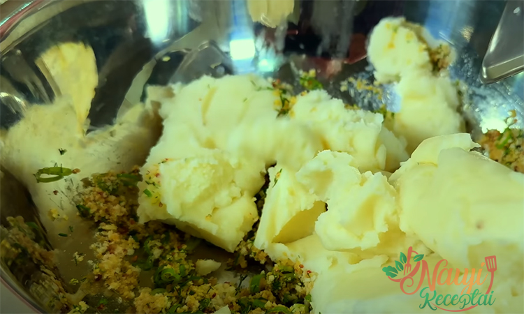 Nusausinkite bulves, nedelsdami supilkite grietinėlę ir sutrinkite, tada įmaišykite sviestą ir šiek tiek džiovinto česnako, įberkite druskos pagal skonį. Tyrelę kelias minutes atvėsinkite. Atskirame dubenyje sumaišykite kiaušinį su Dižono garstyčiomis, sudėkite smulkintus laiškinius svogūnus, krapus ir, jei norite, šviežią česnaką.