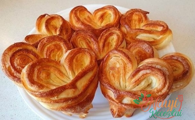 - Perlenkite ritinėlį per pusę ir įpjaukite per vidurį, neperpjaudami iki galo. Praskleiskite puses – gausite širdies formos ritinį.