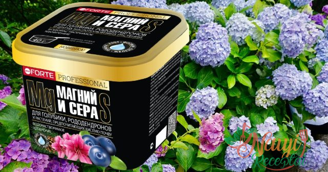 Tačiau jei nenorite užsiimti alchemija ir skubiai papildyti kai kurių elementų trūkumą, galite tiesiog imti kompleksines trąšas hortenzijoms. Tai yra ir visavertis reikalingų maistinių medžiagų šaltinis, ir prevencinė priemonė nuo chlorozės. Tai vandenyje tirpus Bona Forte kompleksas rododendrams, mėlynėms ir kitiems rūgščią terpę mėgstantiems augalams su siera ir magniu . Tai subalansuota trąša krūmams nuo pavasario ir visą vasarą, kurią galima naudoti tiek po šaknimis, tiek ant lapo (kas 10–15 dienų). O siera parūgštins neutralų arba šarminį dirvožemį, kad hortenzijų šaknys jaustųsi patogiai.