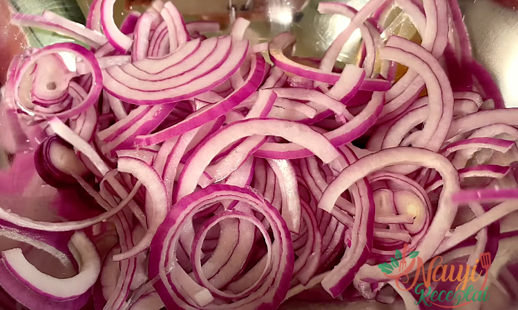 1. Raudonąjį svogūną supjaustykite plonais pusžiedžiais. Stenkitės, kad griežinėliai būtų kuo plonesni – taip skonis bus švelnesnis. Svogūną įdėkite į dubenį su labai šaltu vandeniu (galite įdėti ledo kubelių). Palaikykite 30–40 sekundžių – tai padės pašalinti kartumo perteklių ir suteiks subtilesnį skonį. Nusausinkite vandenį, svogūną nuplaukite po šaltu tekančiu vandeniu ir kruopščiai nusausinkite ant popierinio rankšluosčio.