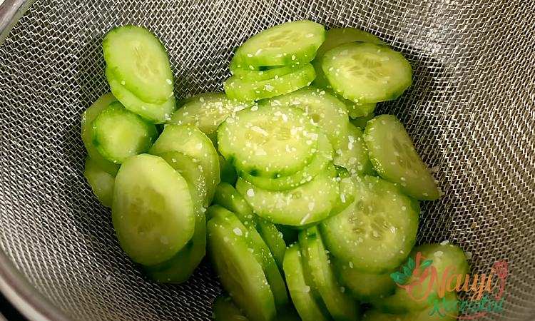2. Agurką gerai nuplaukite ir, jei norite, nupjaukite galiukus bei odelę. Supjaustykite plonais griežinėliais – vienodumui galite naudoti peilį arba daržovių pjaustytuvą, sudėkite į kiaurasamtį, įberkite rupios druskos ir gerai išmaišykite.