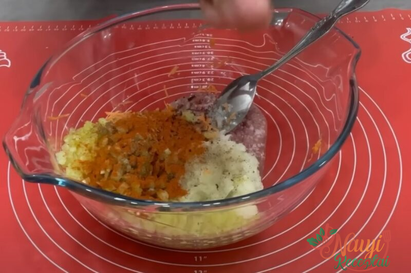Svogūną supjaustykite dideliais kubeliais ir susmulkinkite trintuvu. Morkas sutarkuokite smulkiai, kartu su svogūnu sudėkite į maltą mėsą.