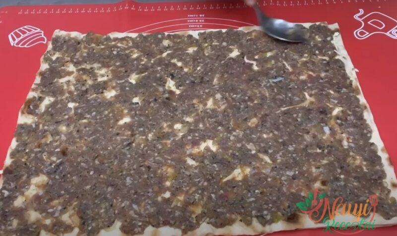 Ant antrojo lavašo dėkite maltos mėsos įdarą ir susukite į ritinėlį su mėsos įdaru viduje.