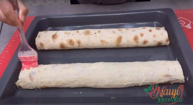 Antrą vyniotinį paruoškite tokiu pačiu būdu, padėkite jį ant kepimo skardos kartu su pirmuoju. Vyniotinių paviršių patepkite grietinės padažu.