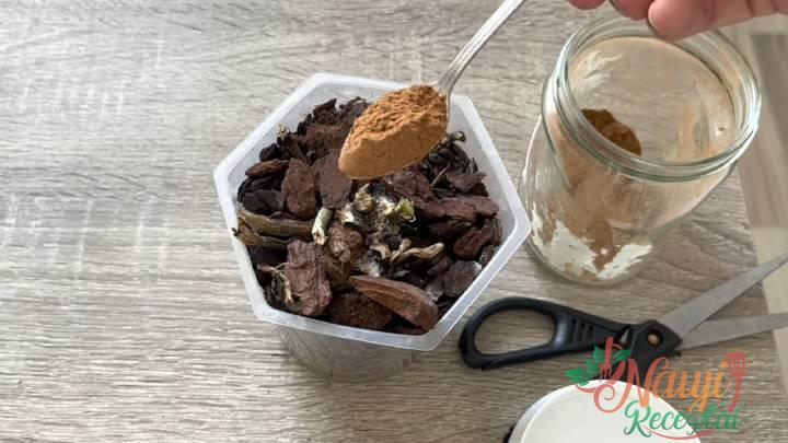 Dabar pažeistą orchidėją reikia dezinfekuoti. Tam paimkite paprastų cinamono miltelių . Pabarstykite visą arbatinį šaukštelį ant šaknies kaklelio. Palikite orchidėją saulėtoje vietoje, kad nupjauta vieta išdžiūtų. Nelaistykite 1 savaitę , nes drėgna aplinka išprovokuoja tolesnį puvimą!
