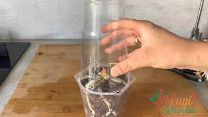 Uždėkite stiklinę ant orchidėjos. Viduje bus sukurtas mikroklimatas, kuris apsaugos ir atkurs pažeistą orchidėją.