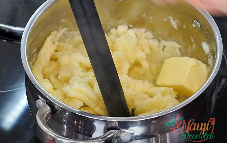 1. Jei jau turite paruoštos bulvių košės, pašildykite ją, kol sušils, kad būtų lengva tepti ant vaflių sluoksnių. Jei reikia, įdėkite sviesto (50 g), kad tekstūra būtų minkštesnė. Susmulkinkite krapus ir sumaišykite su tyre – tai suteiks gaivumo ir aromato. Jei neturite paruoštos bulvių košės, išvirkite bulves, sutrinkite, įdėkite sviesto, druskos, šiek tiek pieno arba grietinėlės pagal skonį.