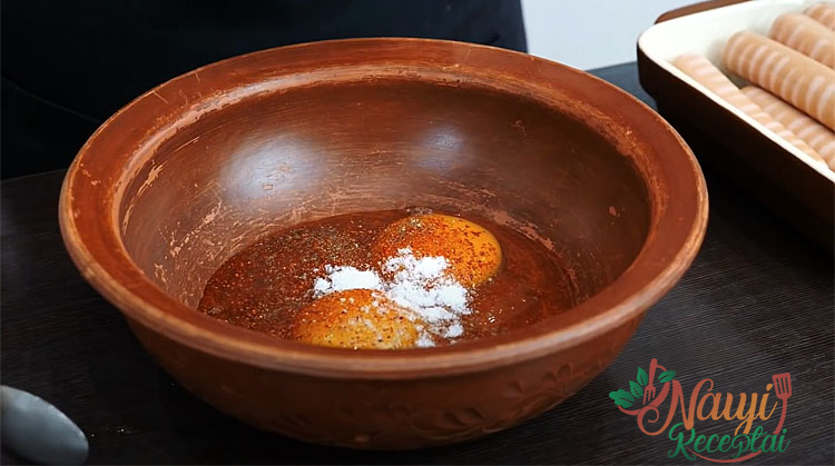 2. Dubenyje šakute arba plaktuvu išplakite 2 kiaušinius. Įberkite druskos, pipirų ir maltos paprikos. Jei norite, įberkite tarkuoto sūrio – plutelė bus sodresnė ir apetitiškesnė. Viską išmaišykite iki vientisos masės.