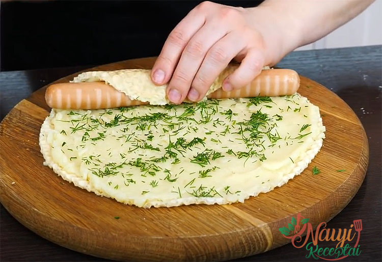 3. Ant stalo išdėliokite vaflių sluoksnius. Ant kiekvienos sluoksnio pusės uždėkite ploną, lygų bulvių košės sluoksnį (apie 2–3 valgomuosius šaukštus). Bulvių košę pabarstykite smulkintomis žolelėmis. Ant vieno sluoksnio krašto uždėkite po dešrą ir atsargiai susukite į ritinį. Tada aštriu peiliu supjaustykite ritinį į porcijas, kad kiekviename gabalėlyje būtų po vieną dešrą, apsuptą bulvių koše.