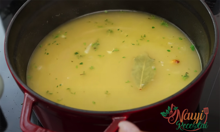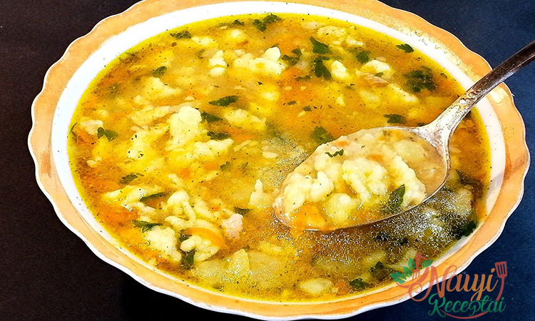 Kol sultinys verda, smulkiai supjaustykite svogūną, sutarkuokite morkas, bulves supjaustykite juostelėmis. Bulvių košei išplakite kiaušinį su žiupsneliu druskos ir vandens, sušlapinkite rankas šiame mišinyje, pamirkykite jas miltuose ir susukite į stambius trupinius – taip gausite tuos pačius „kaimiškus vermišelius“.