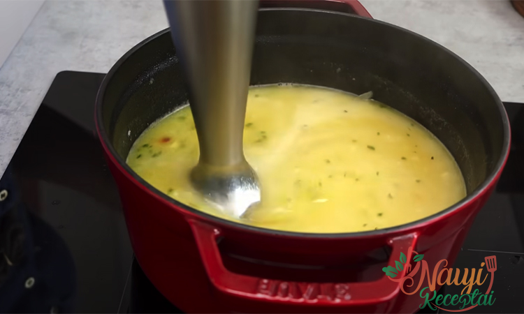 Nusijokite miltų perteklių. Kai sultinys išvirs, išimkite vištieną, atskirkite mėsą nuo kaulų ir sudėkite atgal į keptuvę. Sudėkite bulves, tada svogūnus ir morkas – žalias arba lengvai troškintas be aliejaus. Užvirus, sudėkite makaronus ir virkite 2 minutes, tada išjunkite ir leiskite sriubai pritraukti 10 minučių.