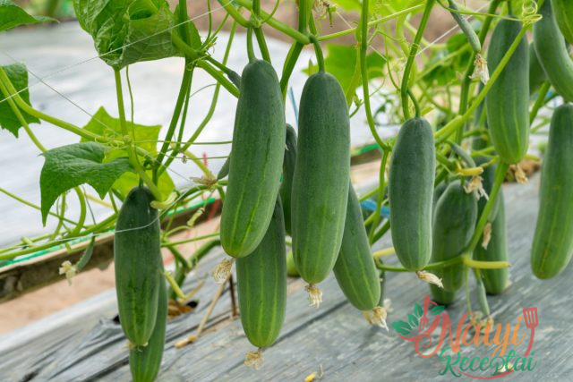 Agurkų rišimas yra būtinas geresniam apšvietimui, vietos taupymui ir savininkų patogumui – agurkus lengva skinti.