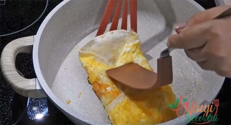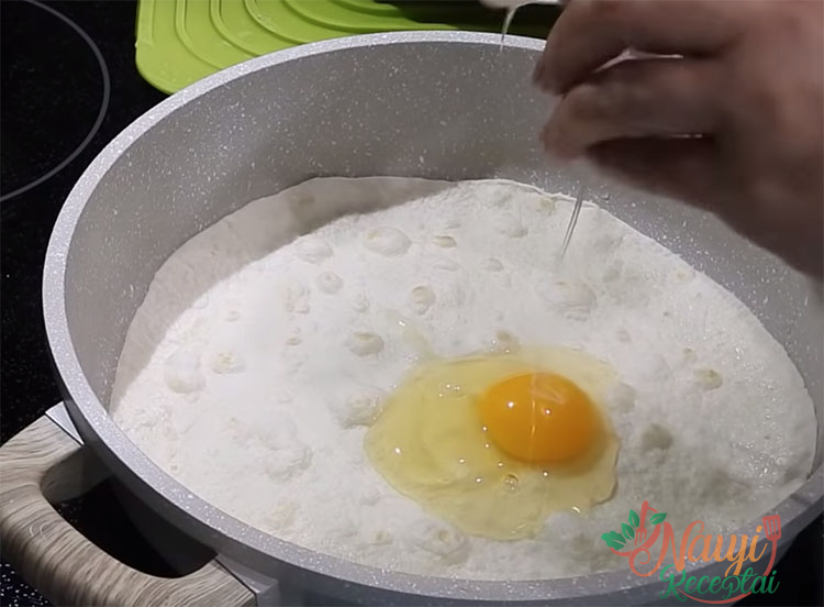 2. Įkaitinkite keptuvę ant vidutinės ugnies. Įpilkite šiek tiek augalinio aliejaus ir tolygiai paskirstykite jį ant paviršiaus. Sudėkite lavašą ant įkaitintos keptuvės. Nedelsdami įmuškite kiaušinį tiesiai ant lavašo.