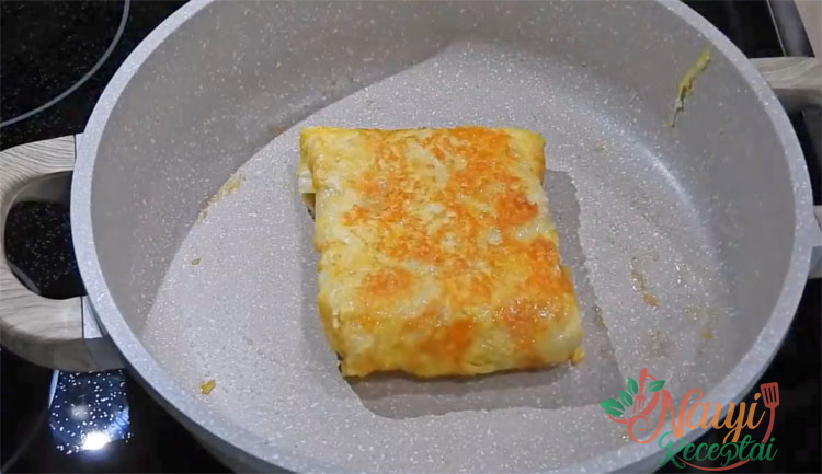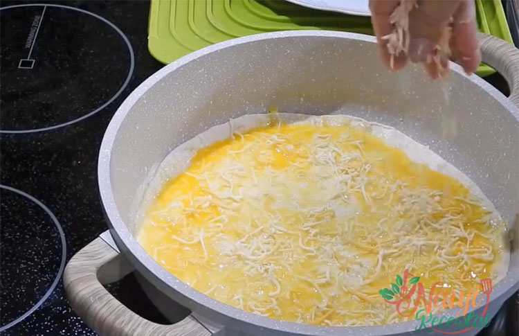 3. Šaukštu arba teptuku atsargiai paskleiskite kiaušinį per visą paviršių, stengdamiesi jį tolygiai paskirstyti. Ant viršaus pabarstykite pusę tarkuoto sūrio. Kepkite 1–1,5 minutės, kol kiaušinis šiek tiek sustings, o sūris pradės lydytis.