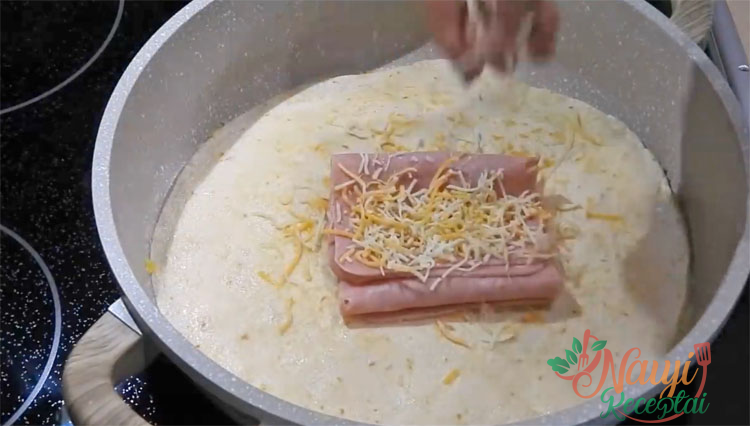 4. Atsargiai apverskite lavašą į kitą pusę – tai darykite mentele, kad jis nesuplyštų. Kumpio riekeles sudėkite į lavašo centrą. Ant viršaus pabarstykite dar sūrio – tai padės užkandžiui „suklijuoti“, kai jį susukate.