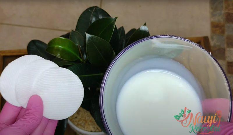 Kiekvieną fikuso lapą patrinkite piene suvilgytu vatos diskeliu. Jei ant lapų buvo dulkių ir nešvarumų, vatos diskelį reikia keisti kelis kartus.