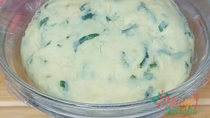 Išvirkite bulves, nupilkite vandenį. Įberkite druskos pagal skonį, įmuškite kiaušinį ir sviestą, sutrinkite iki tyrės. Suberkite smulkiai supjaustytas petražoles, išmaišykite. Suberkite kepimo miltelius ir miltus. Minkykite minkštą tešlą. Uždenkite plėvele, padėkite į šaldytuvą 20 minučių, kol ruošite įdarą.