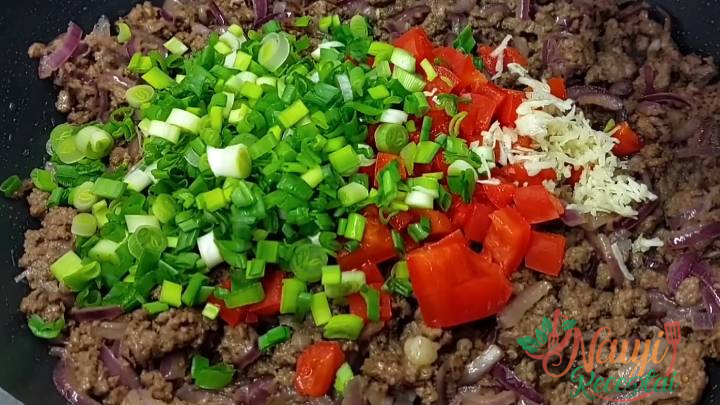 Maltą mėsą apkepkite nedideliame kiekyje augalinio aliejaus. Sudėkite pjaustytas daržoves (svogūnus, papriką, žalumynus, česnakus) ir pomidorų pastą. Įberkite druskos ir pipirų pagal skonį, troškinkite, kol iškeps.