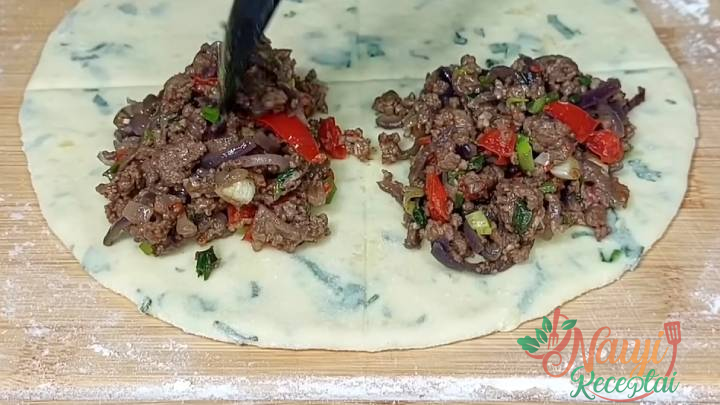 Tešlą padalinkite į 4 dalis . Kiekvieną dalį iškočiokite į apskritimą. Padalinkite tešlą į 4 dalis . Ant kiekvienos dalies uždėkite daug atvėsusio įdaro.