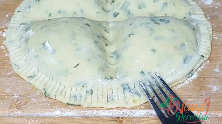 Uždenkite antrąja tešlos puse. Kraštus suspauskite šakute. Peiliu padalinkite 4 pyragėlius.