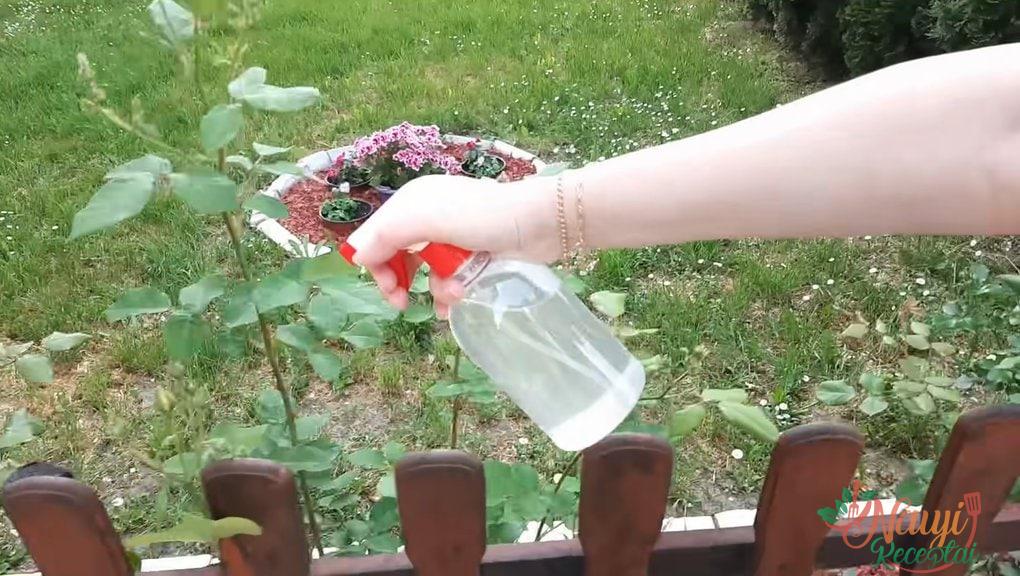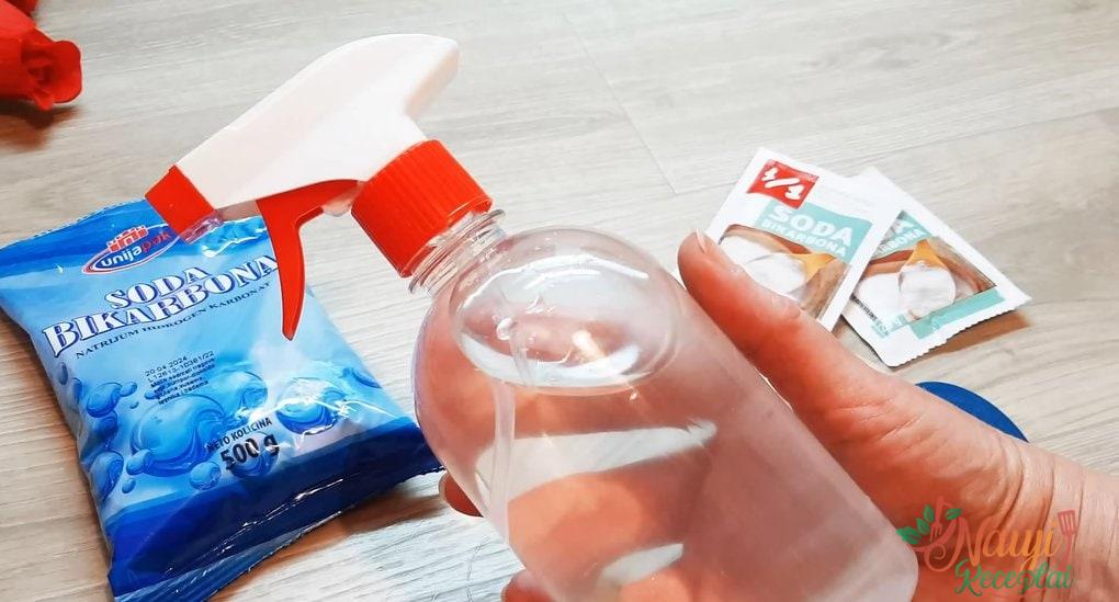 Norint paruošti veiksmingą priemonę nuo amarų, ištirpinkite 1 arbatinį šaukštelį sodos 1 litre vandens. Supilkite paruoštą priemonę į purškimo buteliuką.