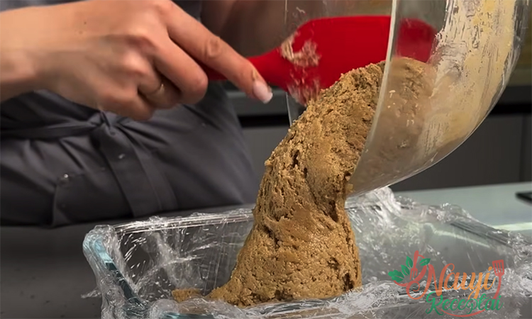 Sėklų pastą sumaišykite su baltymų ir cukraus mišiniu iki vientisos masės. Jei norite, įberkite riešutų arba džiovintų vaisių. Mišinį supilkite į kepimo formą, išklotą plėvele arba kepimo popieriumi. Išlyginkite, uždenkite plėvele ir šaldykite bent 3 valandas.