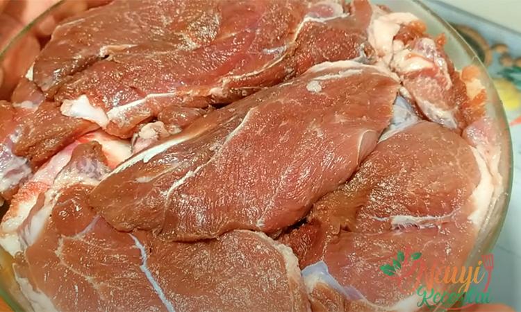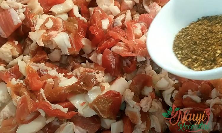 Mėsą supjaustykite dideliais gabalais giliame dubenyje ir pabarstykite nitrito ir įprastos druskos mišiniu. Viską gerai išmaišykite ir padėkite į šaldytuvą parai. Tada išimkite mėsą ir trečdalį supjaustykite plonomis juostelėmis, o du trečdalius – maždaug pusantro centimetro kubeliais. Mėsą perkelkite į švarų dubenį ir pabarstykite prieskoniais – čia receptas leidžia eksperimentuoti, sutelkite dėmesį į savo skonį.