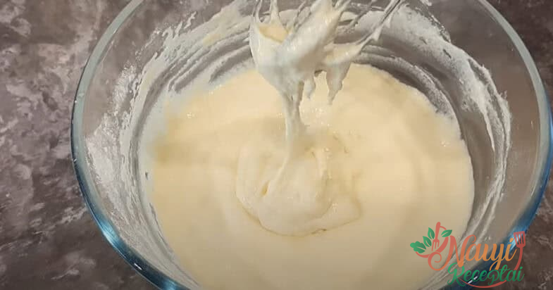Dubenyje sumaišau kiaušinį su druska ir cukrumi. Supilu kefyrą, suberiu miltus ir išmaišau. Tada įdedu sviestą ir išmaišau. Galiausiai įberiu sodos.