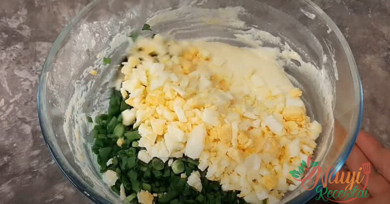 Virtus kiaušinius supjaustau kubeliais ir smulkiai susmulkinu laiškinius svogūnus. Sumaišau juos su tešla.