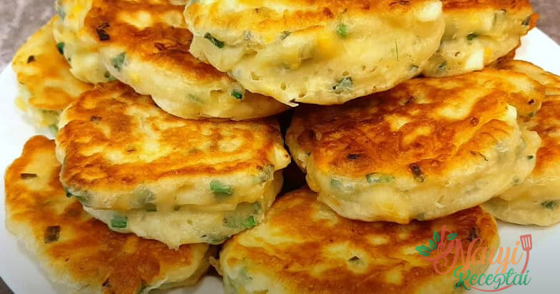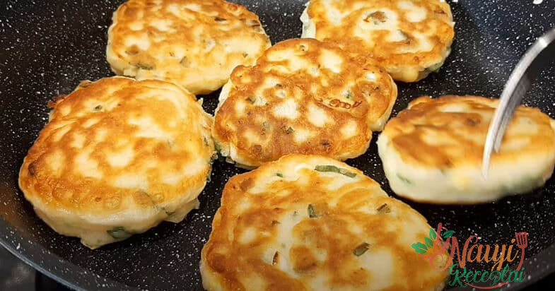 Įkaitinu aliejų keptuvėje ir šaukštu supilu mišinį.