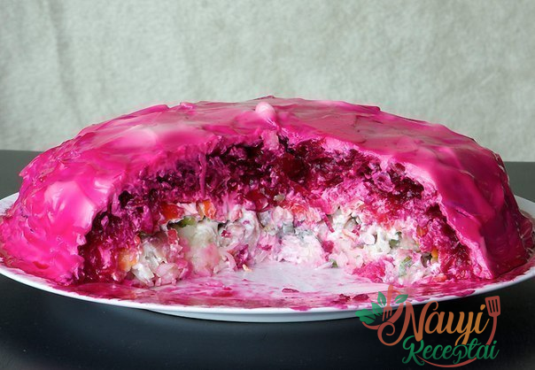 7. Visas salotas padenkite tolygiai virtų burokėlių, taip pat sutarkuotų stambia tarka, sluoksniu. Ir vėl visą paviršių aptepkite majonezu.