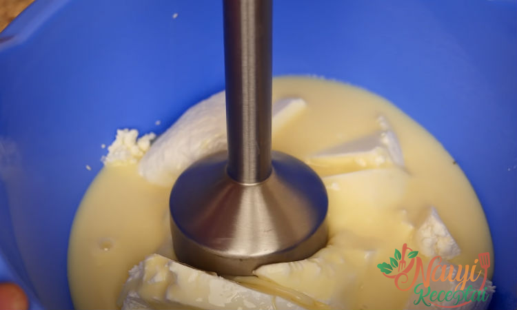2. Giliame dubenyje šaukštu arba šakute lengvai sutrinkite 600 g varškės. Supilkite kondensuotą pieną. Viską išplakite trintuvu (panardinamuoju arba stacionariu), kol gausite vientisą, kreminę masę be gumulėlių.