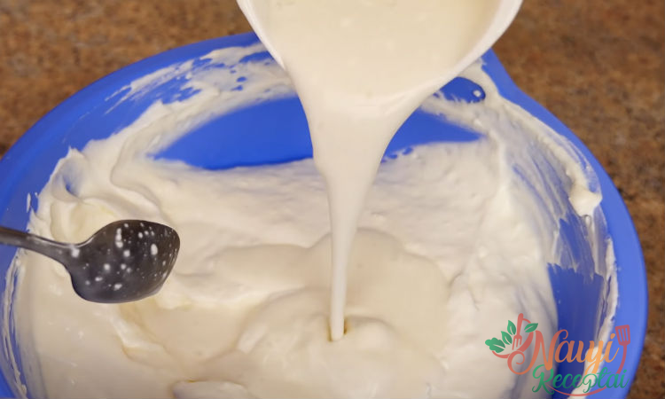 3. Atskirai plakite 30 ml grietinės mikseriu dideliu greičiu 1–2 minutes. Grietinė turi tapti puri ir šiek tiek puri, bet nevirsti sviestu.