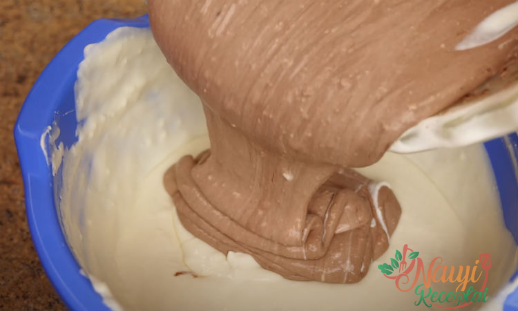 5. Gautą masę padalinkite į dvi lygias dalis. Į vieną iš jų įberkite 30 g per sietelį persijotų kakavos miltelių. Šią dalį plakite mikseriu iki vientisos šokolado spalvos. Antrąją pusę palikite be priedų – ji bus vanilinė arba neutrali.