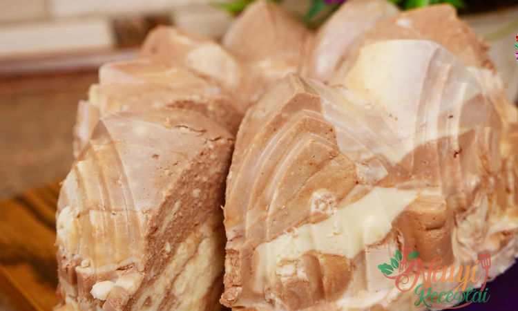 6. Supilkite vieną masės dalį į formą, tada antrą dalį – galite sluoksniuoti arba atsargiai išmaišyti, kad gautumėte marmuro efektą. Naudokite silikoninę formą, stiklinį dubenį arba indą. Išlyginkite viršų ir uždenkite maistine plėvele arba dangčiu.