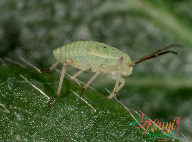 Iš pradžių nimfos minta augalų pagrindu, bet vėliau persikelia į gležnus lapus. Dėl maitinimosi lapai tampa raukšlėti ir tamsiai žali. Nors vaisiai tampa maži, dideli derliaus nuostoliai yra reti. Didelės spygliuočių populiacijos dažnai siejamos su piktžolėmis daržo lysvėse, todėl svarbu tinkamai kontroliuoti piktžoles ir taikyti kitus sveiką augalų augimą skatinančius metodus.