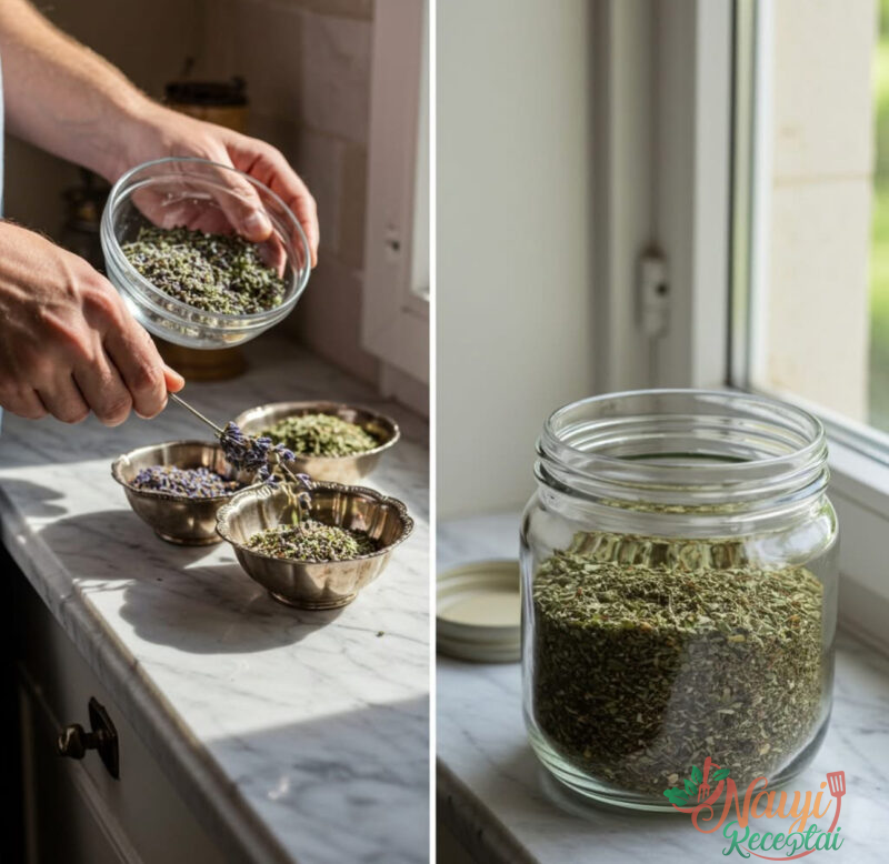 Paruoškite žoleles: pradėkite nuo puodelio džiovintų mėtų ir levandų lapų. Ramunėlės yra neprivalomos, tačiau rekomenduojamos dėl raminančių savybių. Lapus šiek tiek sutrinkite rankomis, kad išsiskirtų jų eteriniai aliejai, kurie veiksmingai atbaido vabzdžius.