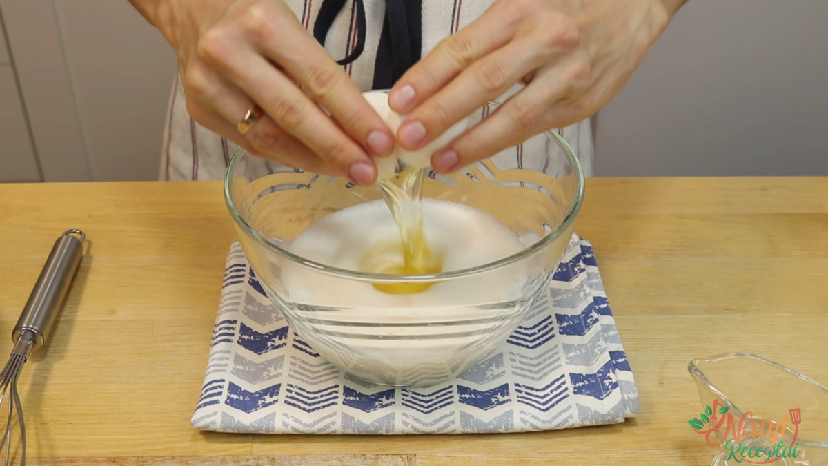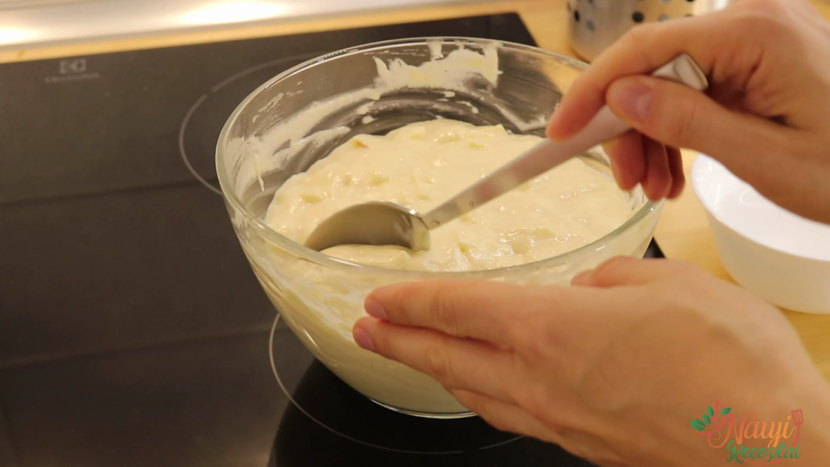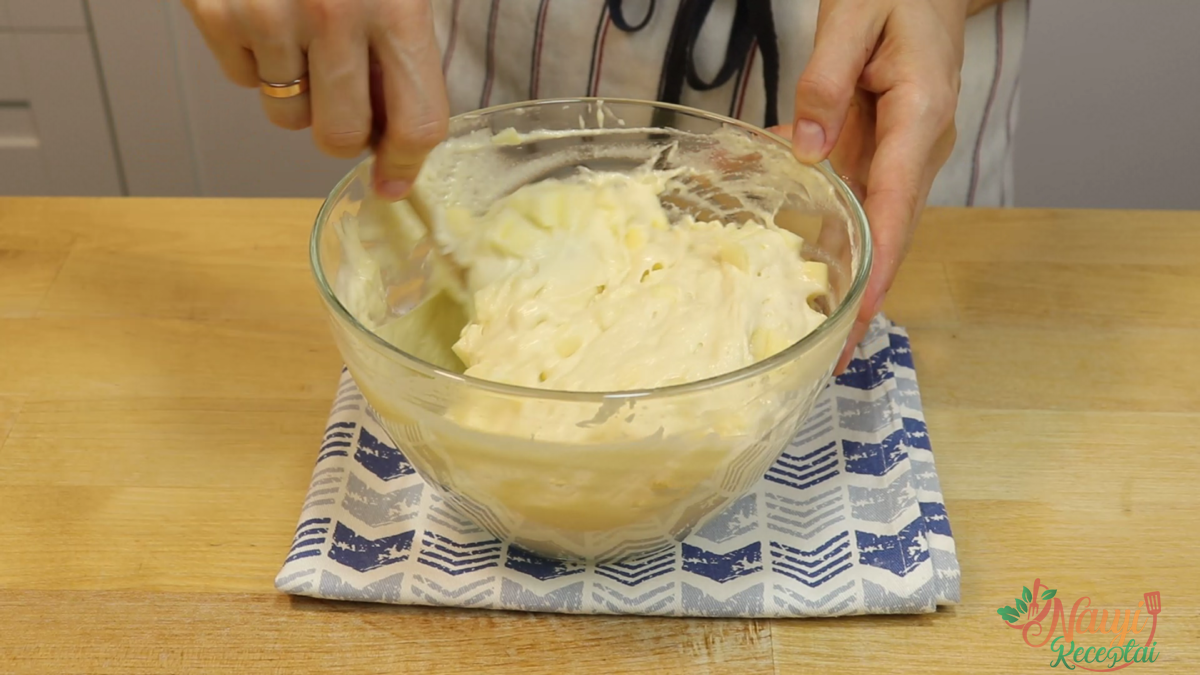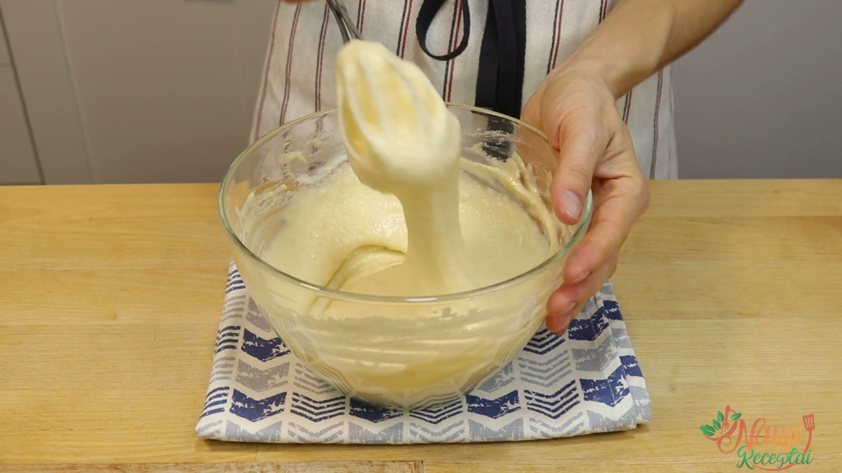 Tešlą semiu šaukštu, pamirkytu vandenyje. Daugiau tešlos nemaišau.