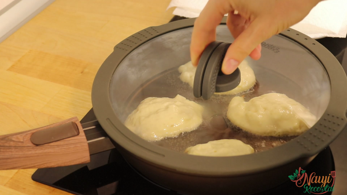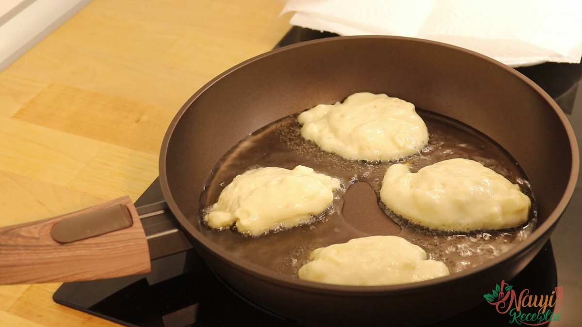 Dedu juos ant įkaitinto aliejaus, toliau vienas nuo kito. Blyneliai padidės.
