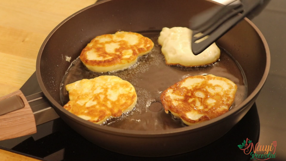 Apverčiu juos į kitą pusę. Kepu blynus iki auksinės rudos spalvos.