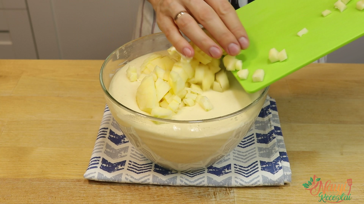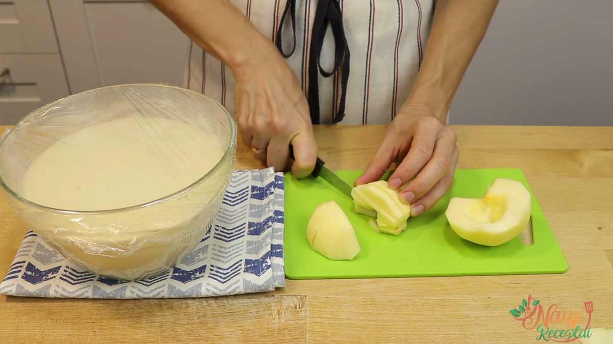 Kai tešla pakyla, nulupau obuolius ir supjaustau juos kubeliais.