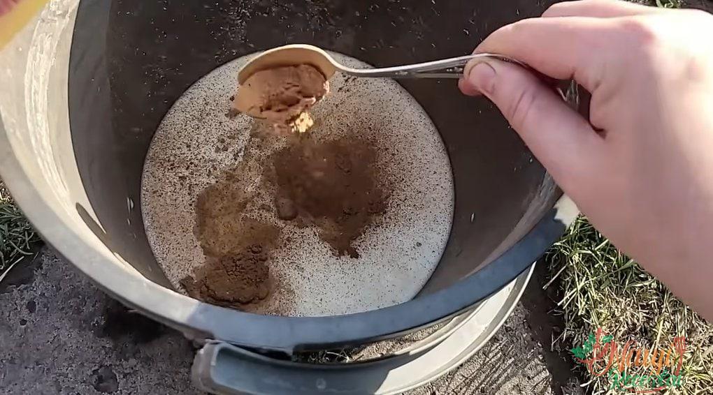 Pirmam užpilui paruošti į 10 litrų kibirą supilkite 1 litrą pieno. Į pieną įberkite 2 arbatinius šaukštelius cinamono. Cinamono naudojimo efektyvumas paaiškinamas tuo, kad jame yra daug kalcio, geležies, mangano, vario, vitaminų A, B1, B2, cholino, B5, B9, C, E, kalio, magnio, fosforo, 18 aminorūgščių. Be to, specifinis cinamono kvapas atbaido kenkėjus nuo augalų.
