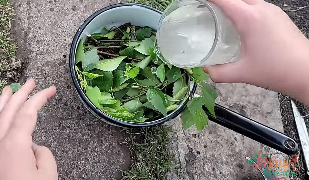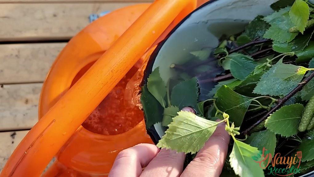 Tirpalą perkoškite ir įpilkite 10 l. Trąšas beržo lapų pagrindu galima naudoti tiek po šaknimis, tiek purškiant augalus ant lapų. Trąšas naudokite kartą per savaitę.