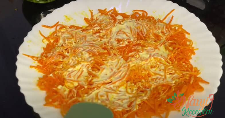 Ant plokščios lėkštės kaip pirmąjį salotų sluoksnį padėjau korėjietiško stiliaus morkas.