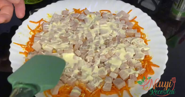 Toliau kiauliena supjaustoma kubeliais ir aptepama majonezu.